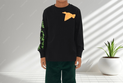 平織棉長袖上衣,印有新季水鳥圖案和品牌徽標。