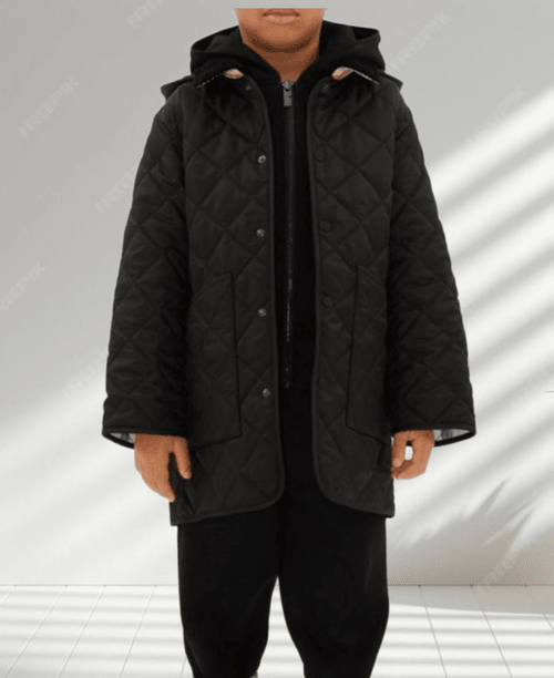 絎縫連帽大衣,設有同色系燈芯絨衣領。搭配 Burberry格紋襯裡。