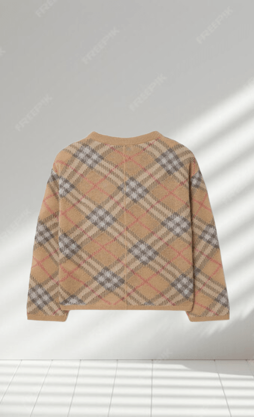 開襟針織衫,選用羊駝毛和桑蠶絲混紡製成,飾 有針織 Burberry格紋。