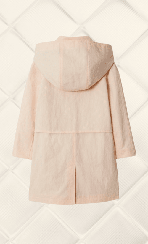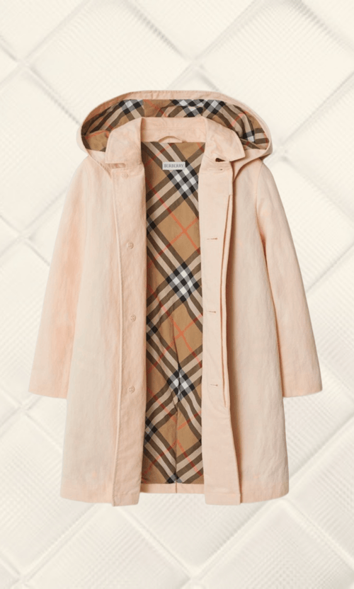 尼龍棉質斜紋布輕便大衣,採用隱藏式鈕扣開襟。設計附有可拆式連帽及 Burberry 格紋襯裡。